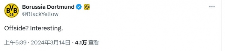 本场比赛第77分钟,菲尔克鲁格利用任意球头球破门,但是经过VAR认定越位在先进球无效。多特官推发文表示质疑:“这球越位吗?有点意思”