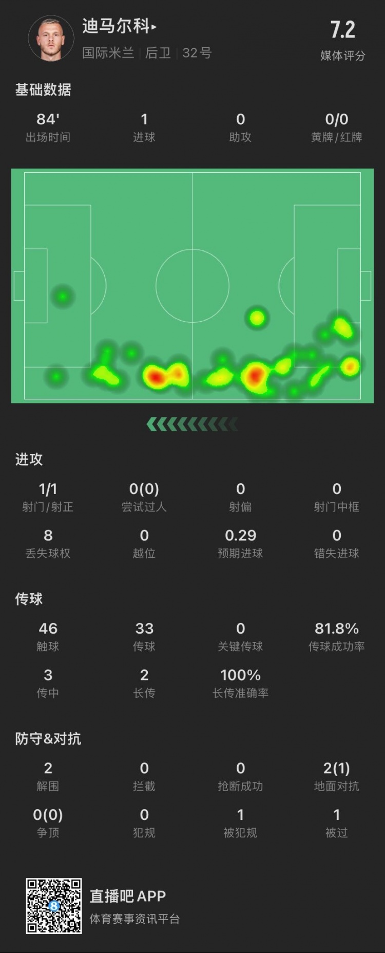 3月14日讯 欧冠1/8决赛次回合,90分钟战罢,马竞总比分2-2战平国米。本场比赛,迪马尔科打进一球,在第84分钟被换下场,获评7.2分,暂列队内第三高。