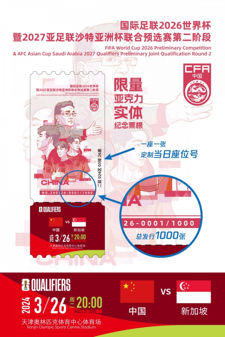 3月26日比赛专属的纪念球票由高品质亚克力材料制成,质感细腻,色彩上采用了鲜艳的中国红,并列明了赛事信息。主体设计则使用了国足新帅伊万科维奇先生以及三名国家队球员的形象,他们眼神坚定,充满斗志。