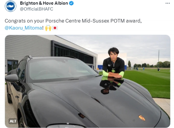 布莱顿的月最佳奖项与保时捷合作颁发,当月最佳球员获得保时捷——的48小时使用权。三笘薰赛季第3次获此特权。