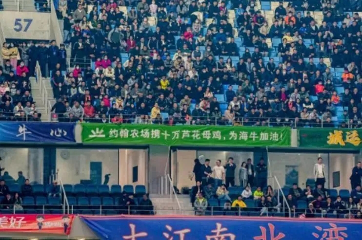 还记得去年中超看台上一条出圈的广告横幅?“约翰农场携10万芦花母鸡为青岛海牛加油!”今年情况更普遍。