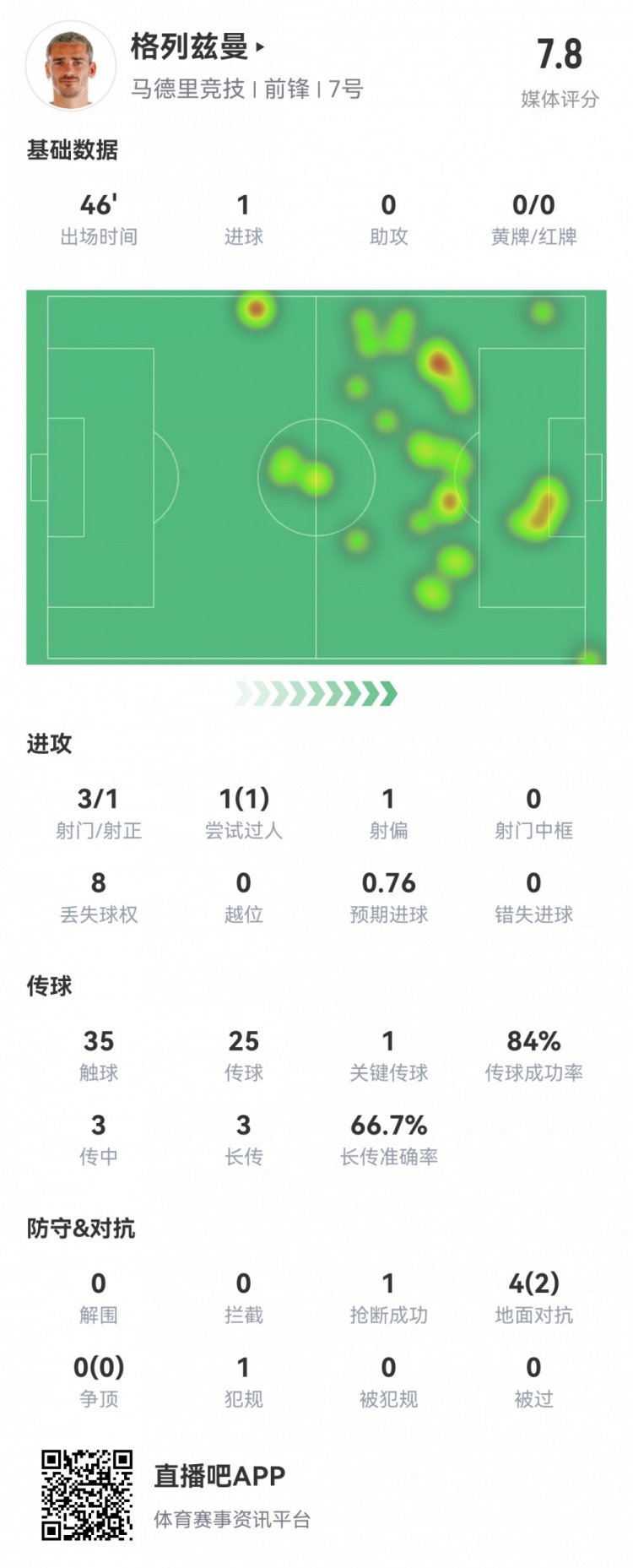 数据方面,格列兹曼3次射门1次射正,打进1球,1次关键传球,评分7.8分暂列全场最高!