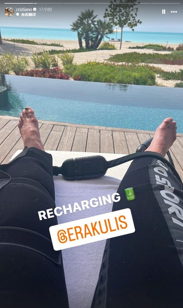照片中,C罗躺在泳池边上休息,他为照片配文“充电中”。另外他还转发了乔治娜的视频,从另一个角度拍摄自己恢复体能的时刻。