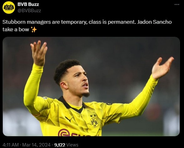 此前桑乔在曼联与滕哈赫关系破裂,随后被租借回多特蒙德,BVB Buzz这番话无疑是对滕哈赫的嘲讽。