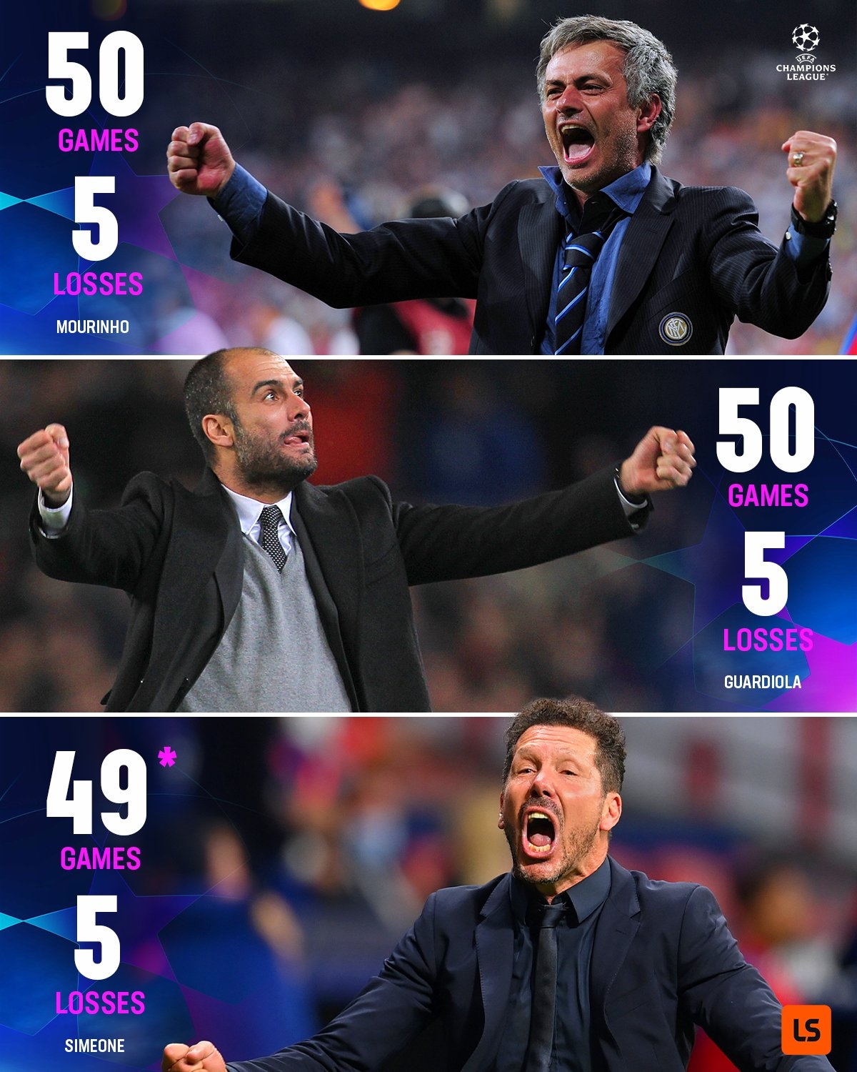 西蒙尼在之前的49场欧冠主场比赛中吃到4场败仗,今天是第50场,若能保持不败,他就将与穆里尼奥和瓜迪奥拉并列第一。