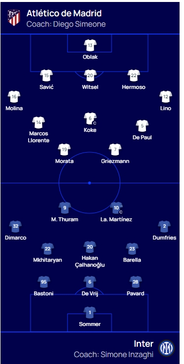 3月14日讯 欧冠1/8决赛次回合,马竞主场对阵国米。双方首回合比赛,国米主场1-0击败马竞。赛前,官方公布了本场的首发名单。