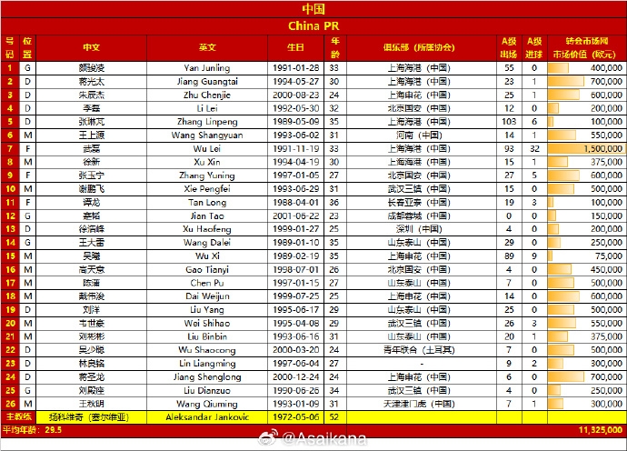 本期名单国足的平均年龄为29.6岁(图中程进年龄有误,应为29岁),新加坡为28.1岁。