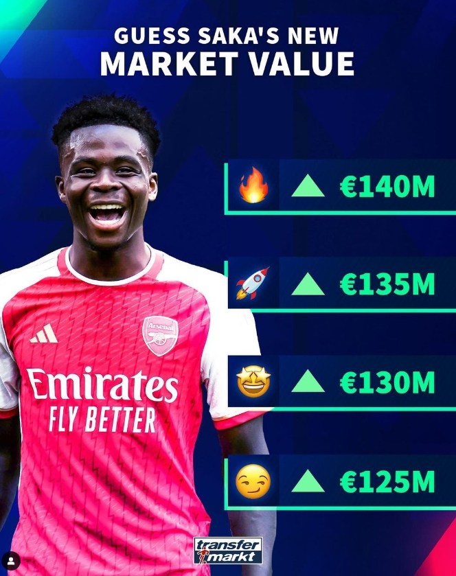 明日德转将会更新英超联赛的球员身价,德转今日预热萨卡身价涨幅,最高将涨到1.4亿欧。