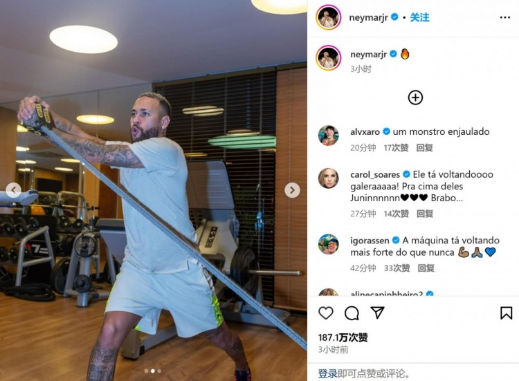 3月20日讯 今天,内马尔在社交媒体中晒出了自己在健身房锻炼的照片,配文: