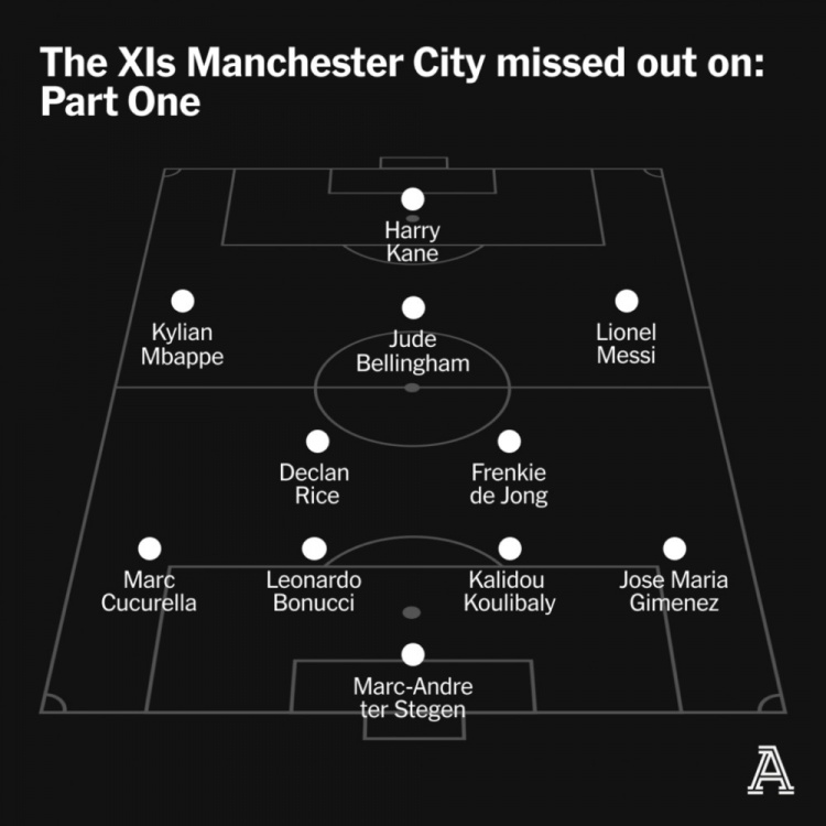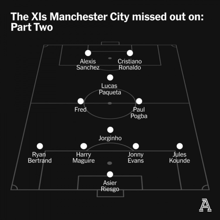 3月20日讯 The Athletic盘点了瓜迪奥拉执教期间,曼城错过的转会目标,其中包括梅西、C罗、博格巴、桑切斯、弗雷德、马奎尔等球员,TA还列出了两套阵容。