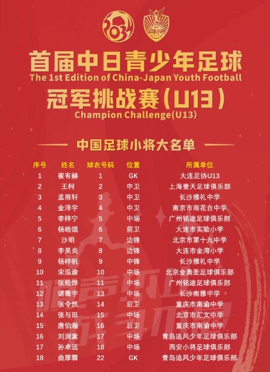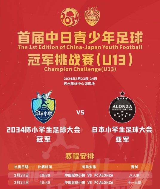 03月20日讯 首届中日青少年足球冠军挑战赛(U13)官宣,将由2034杯冠军中国足球小将vs日本小学生足球大会亚军FC ALONZA,比赛将在3月23-24日在苏州奥体中心训练场进行。