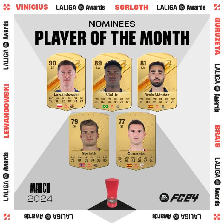 3月20日讯 西甲官方公布了3月份最佳球员的候选名单,莱万、维尼修斯领衔。