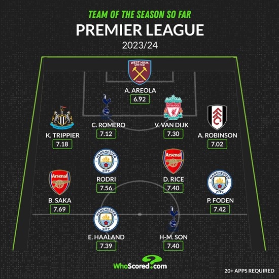 WhoScored英超本赛季至今最佳阵容(至少出场20次)