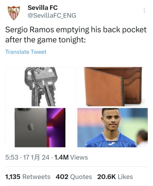 赛后,塞维利亚社媒写道:“比赛结束后,拉莫斯从他的屁股口袋里拿出了这些:”下面的配图是钥匙、钱包、手机和格林伍德……