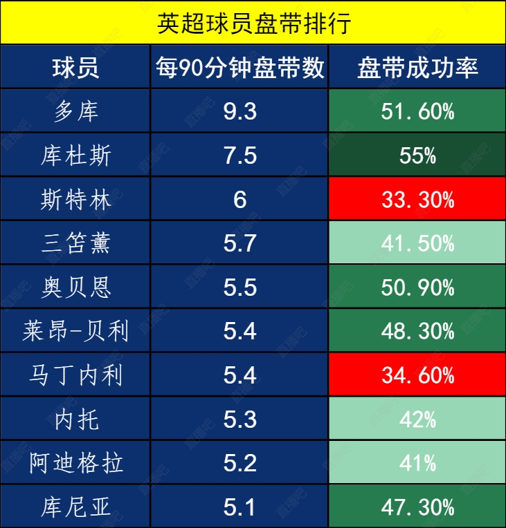 英超盘带排行:多库库杜斯领跑,三笘薰在列,斯特林近7年最低效