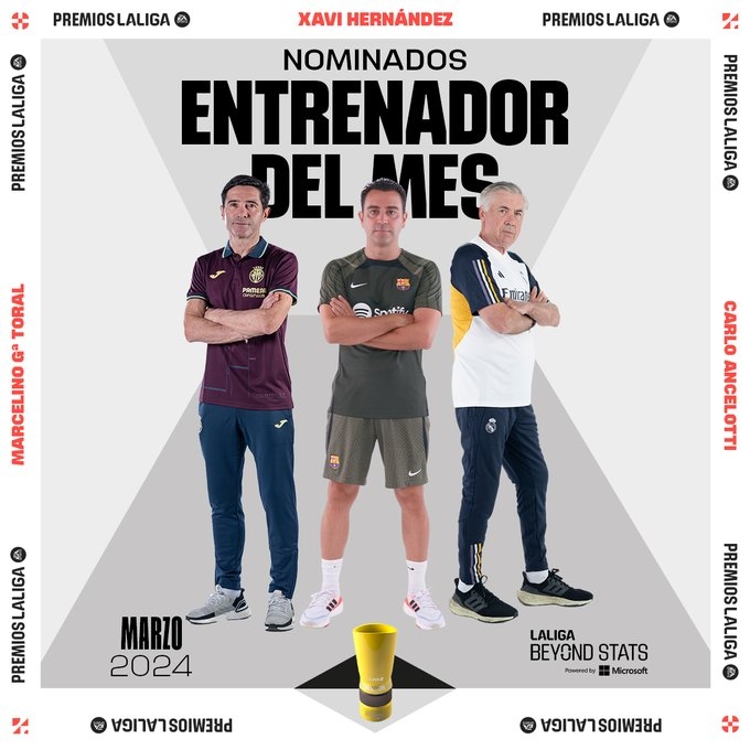 3月20日讯 今日,西甲联赛官推公布了3月份联赛最佳教练候选,其中安切洛蒂、哈维在内。