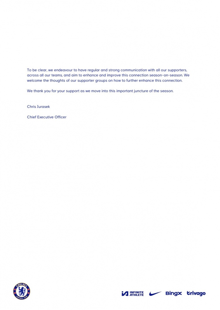 作为对切尔西球迷信托基金给切尔西足球俱乐部的正式信函的回应,感谢您的来信和对切尔西足球俱乐部的坚定支持。我们非常重视所有球迷的奉献、忠诚和愿望,他们将继续把切尔西发展成为世界上最成功、最受尊敬的俱乐部,无论是在球场上还是在球场下。