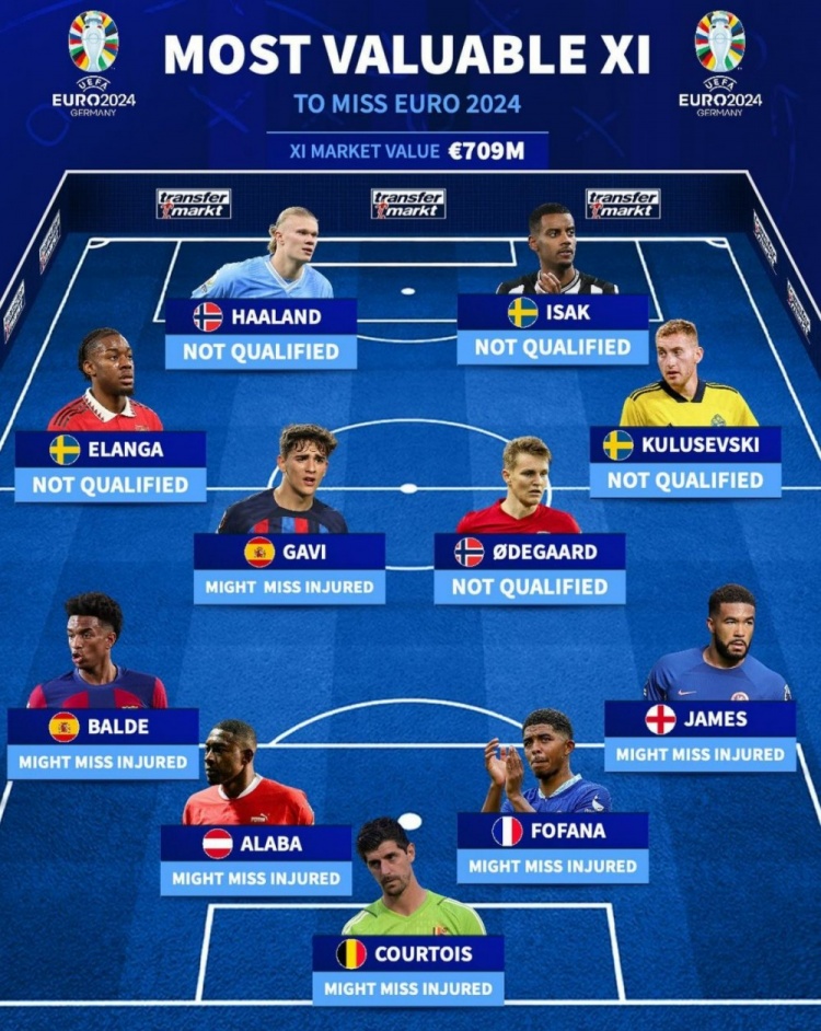 3月21日讯 欧洲杯即将在今夏拉开帷幕,德转盘点了目前预计无法出战欧洲杯球员的最贵阵容,其中哈兰德、厄德高等人已经由于国家队被淘汰而确定无缘,加维等人则由于重伤可能无法赶上欧洲杯。以下为具体阵容: