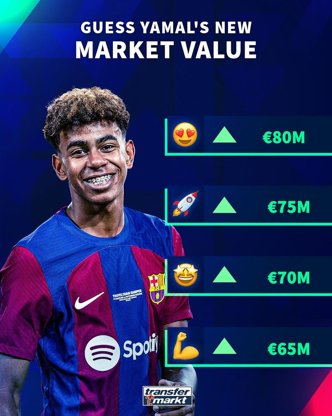 3月21日讯 德转更新动态,巴萨16岁前锋亚马尔的身价即将迎来调整,他的身价将继续上涨!目前亚马尔德转估值为6000万欧。