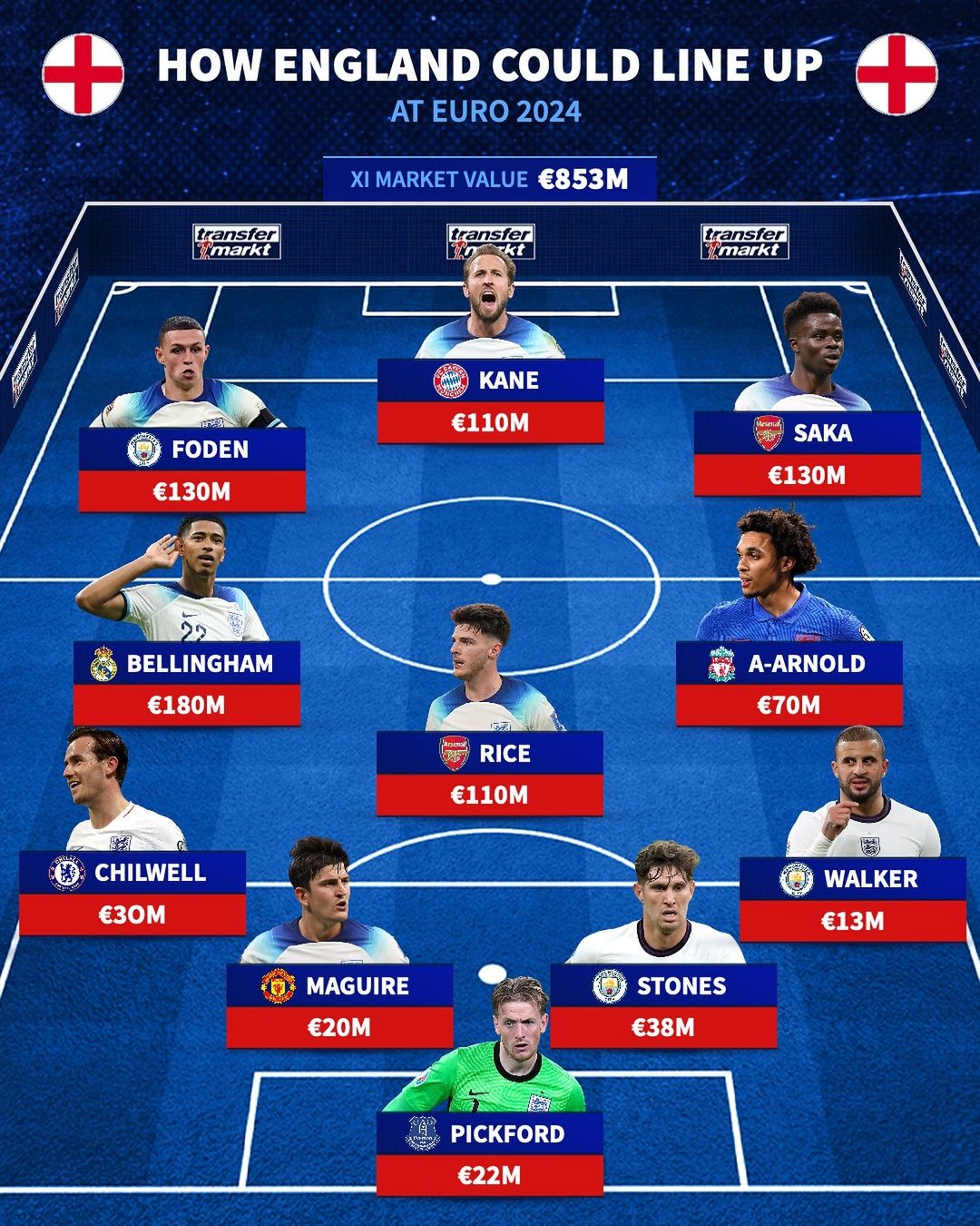 03月21日讯 德转盘点了英格兰在欧洲杯可能排出的阵容,11名球员总身价达到8.53亿欧。