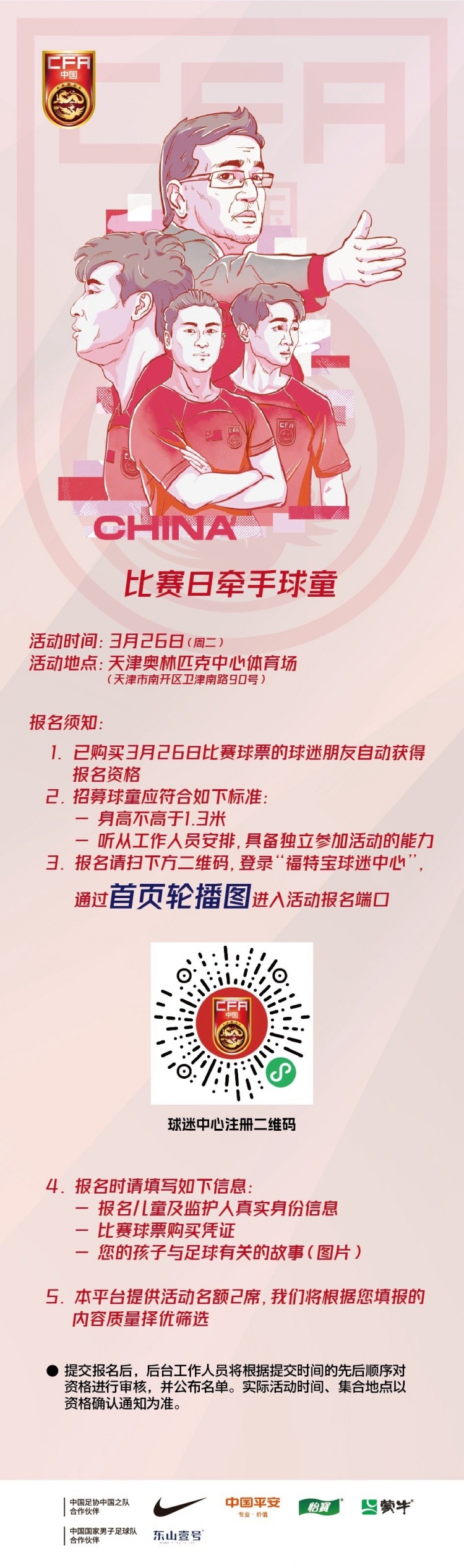 据悉,“足球中国”昨日刚刚发布了中国国家男子足球队球迷见面会的招募信息。很多球迷纷纷留言,希望此类与国家队近距离互动的机会能够更多。为了感谢广大球迷的热爱与支持,今日同时启动中国足协中国之队亲子家庭日和3月26日比赛牵手球童活动的招募工作。