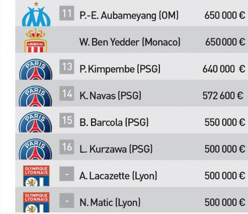 03月21日讯 《队报》对比法甲球员薪水,姆巴佩月薪600万欧遥遥领先,前十被巴黎球员霸榜。