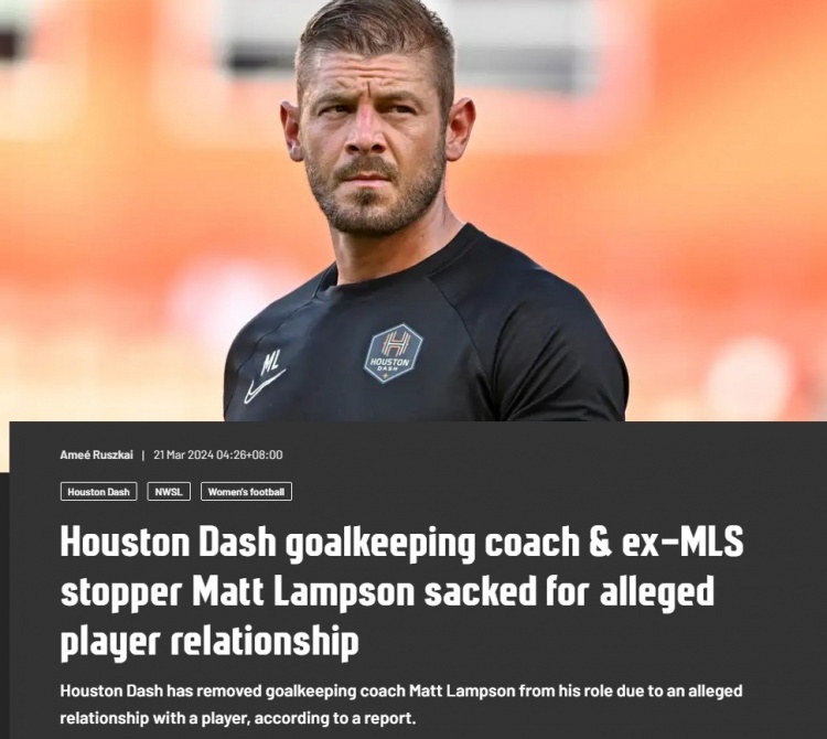 马特-兰普森是休斯顿冲刺的门将教练,媒体称,他与队内的一名球员在去年开始处对象,事情于2024年初在俱乐部内部曝光,随后他在3月18日被解约。