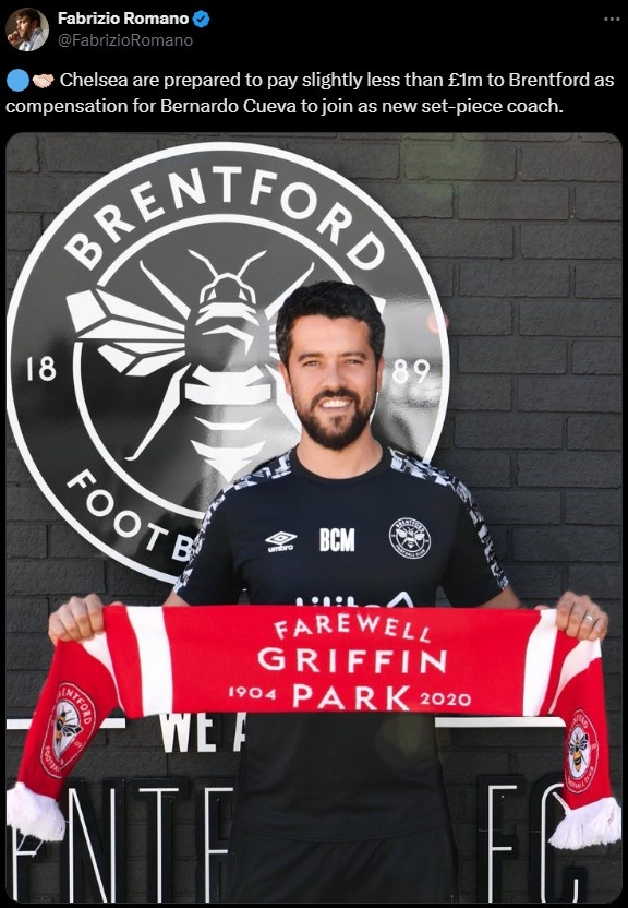 3月15日讯 名记罗马诺报道,切尔西将向布伦特福德支付稍低于100万英镑的赔偿金,以挖角对方的定位球教练贝尔纳多-奎瓦。