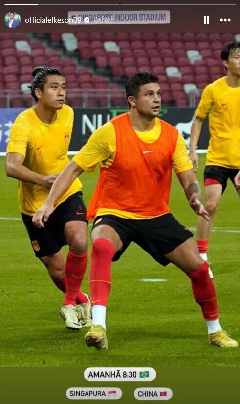 艾克森晒出的赛前踩场训练照,定位为今晚比赛场地新加坡国家体育场。两张照片中,一张是他独自练习射门的照片,另一张是他与张玉宁的对抗。