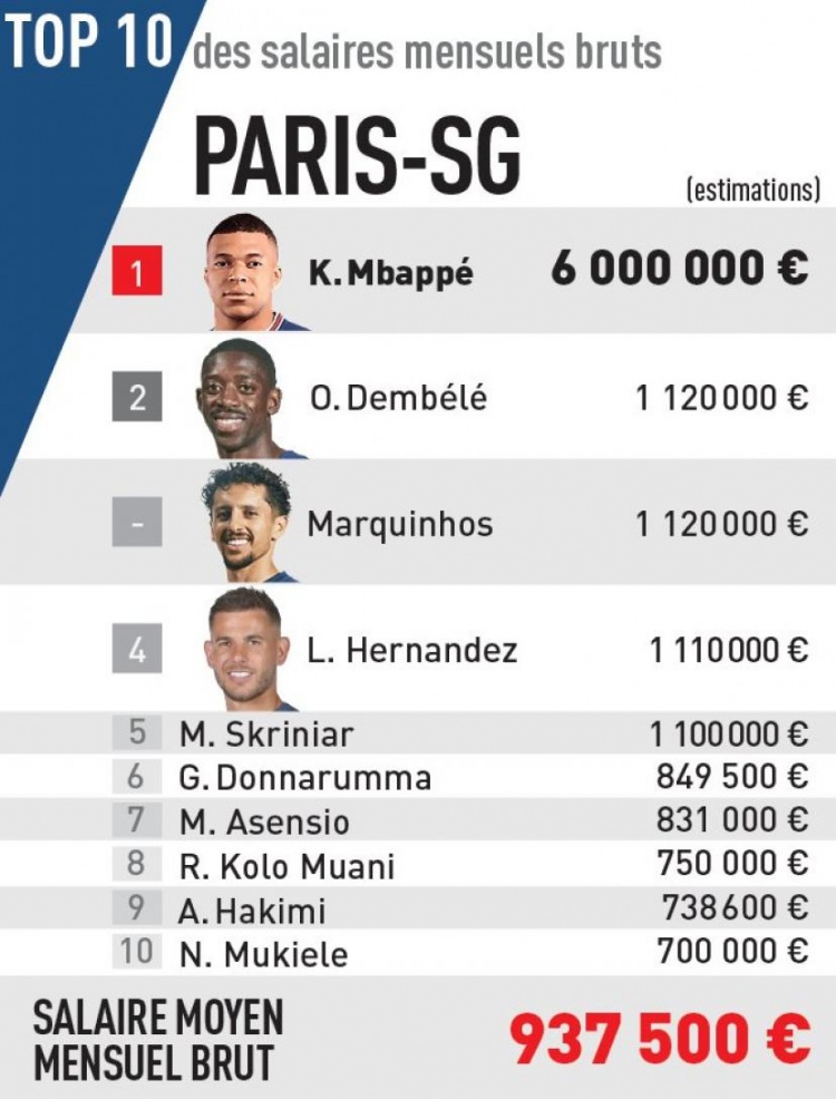 巴黎队内目前月薪最高为姆巴佩的600万欧,其次是登贝莱和马尔基尼奥斯,月薪达到112万欧,然后是卢卡斯和什克里尼亚尔的111万欧。全队平均月薪93.75万欧,依然是个很高的数字。