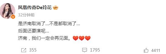 关于演唱会的取消一事,玲花本人在社媒回应表示:“是济南取消了…不是都取消了…后面还要演呢…济南,我们一定会再见面。”