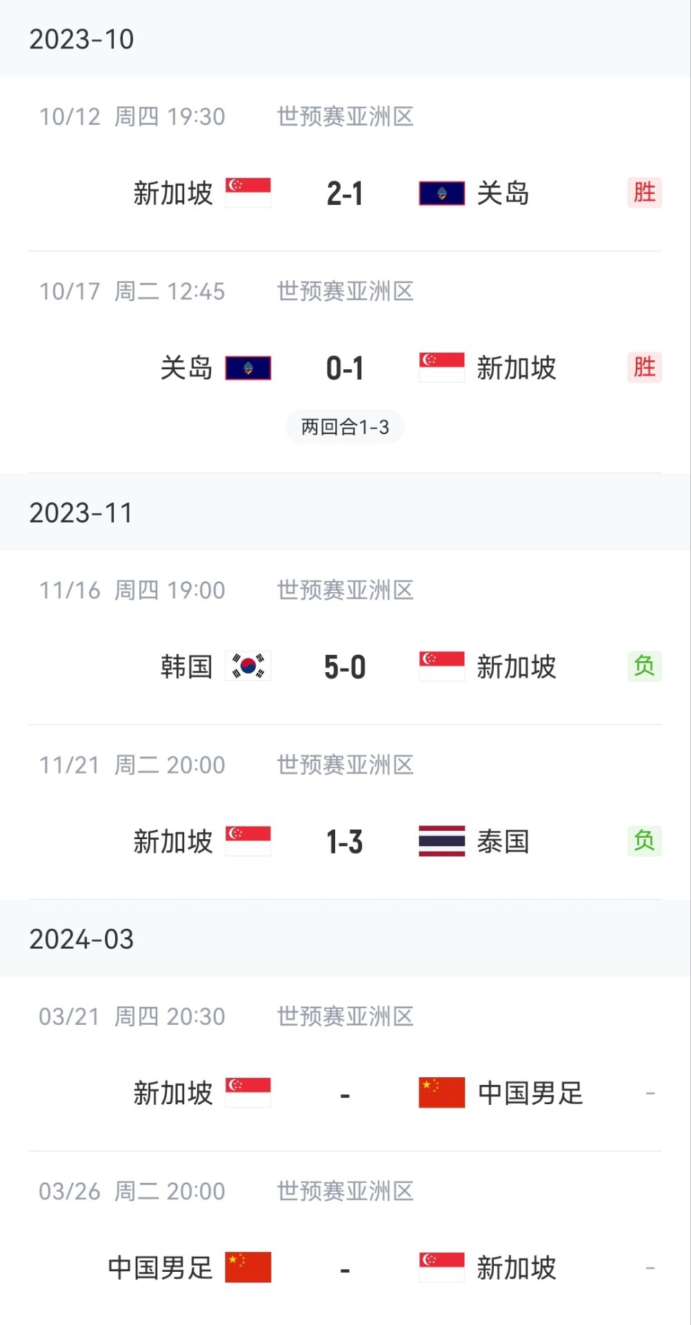 进入世预赛第二阶段,新加坡先是客场0-5不敌韩国,后在主场1-3不敌泰国。目前还未得一分,排名小组垫底。