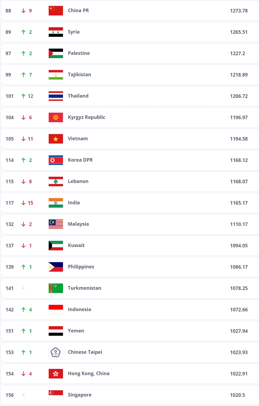 在最新一期国际足联世界排名中,国足排在世界第88亚洲第13,新加坡排在世界第156亚洲第31。