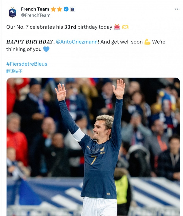 法国队官方账号在社交媒体上晒出格列兹曼的照片,并写道:“我们的7号今天迎来他的33岁生日。生日快乐,格列兹曼!祝你早日康复,我们想念你。”