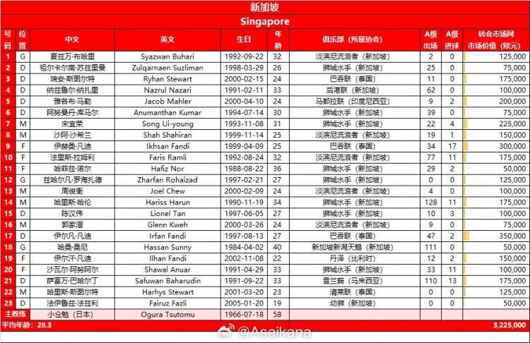 新加坡平均年龄28.3岁,总身价322.5万欧元