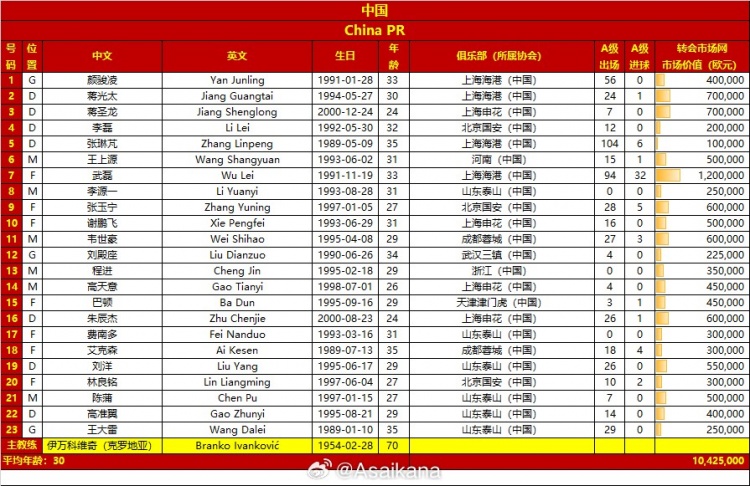 中国队平均年龄30岁,总身价1042.5万欧元