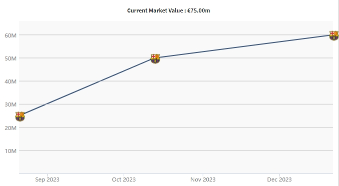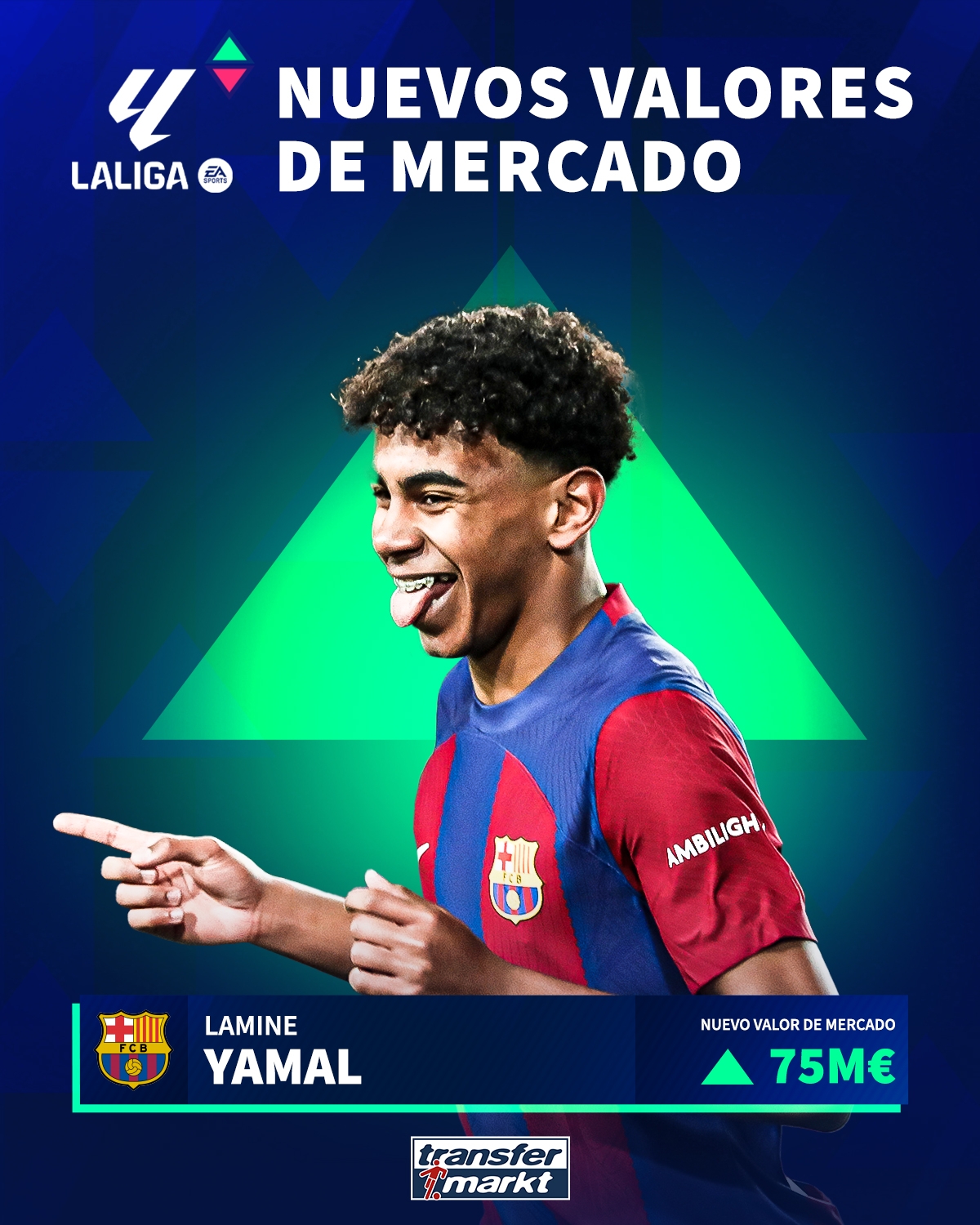 03月21日讯 德转今日更新西甲的身价,巴萨16岁的西班牙国脚亚马尔身价暴涨1500万欧,现在已经高达7500万欧。