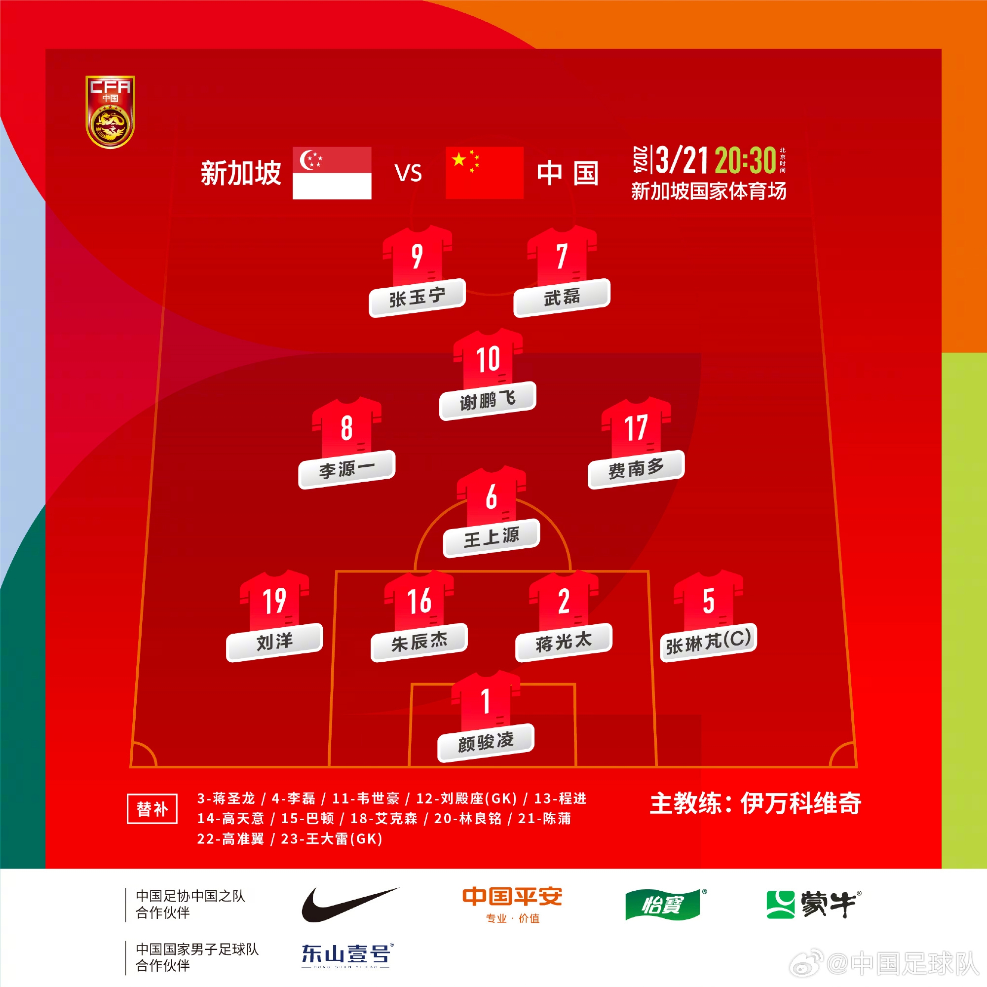 03月21日讯 今天20:30,世预赛亚洲区第二阶段C组第3轮,中国男足客场对阵新加坡男足,赛前双方首发阵容出炉。