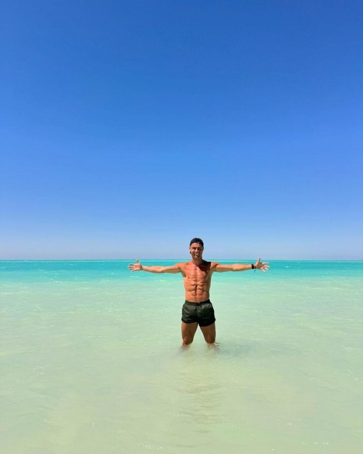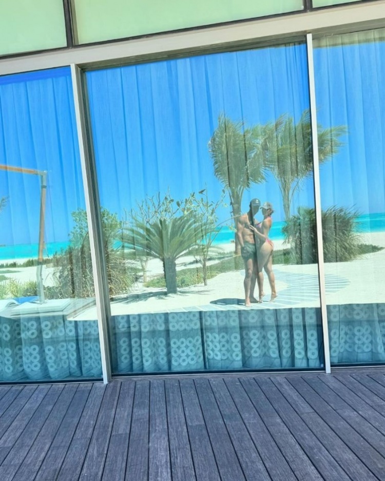 在乔治娜晒出的照片中,她和C罗一起在沙滩上跑步,两人也对着玻璃门自拍,展示好身材。
