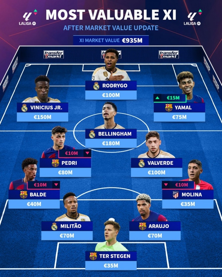 3月22日讯 德国转会市场网站列出了西甲身价最高阵容,维尼修斯、贝林厄姆、亚马尔在列,总身价9.35亿欧元。