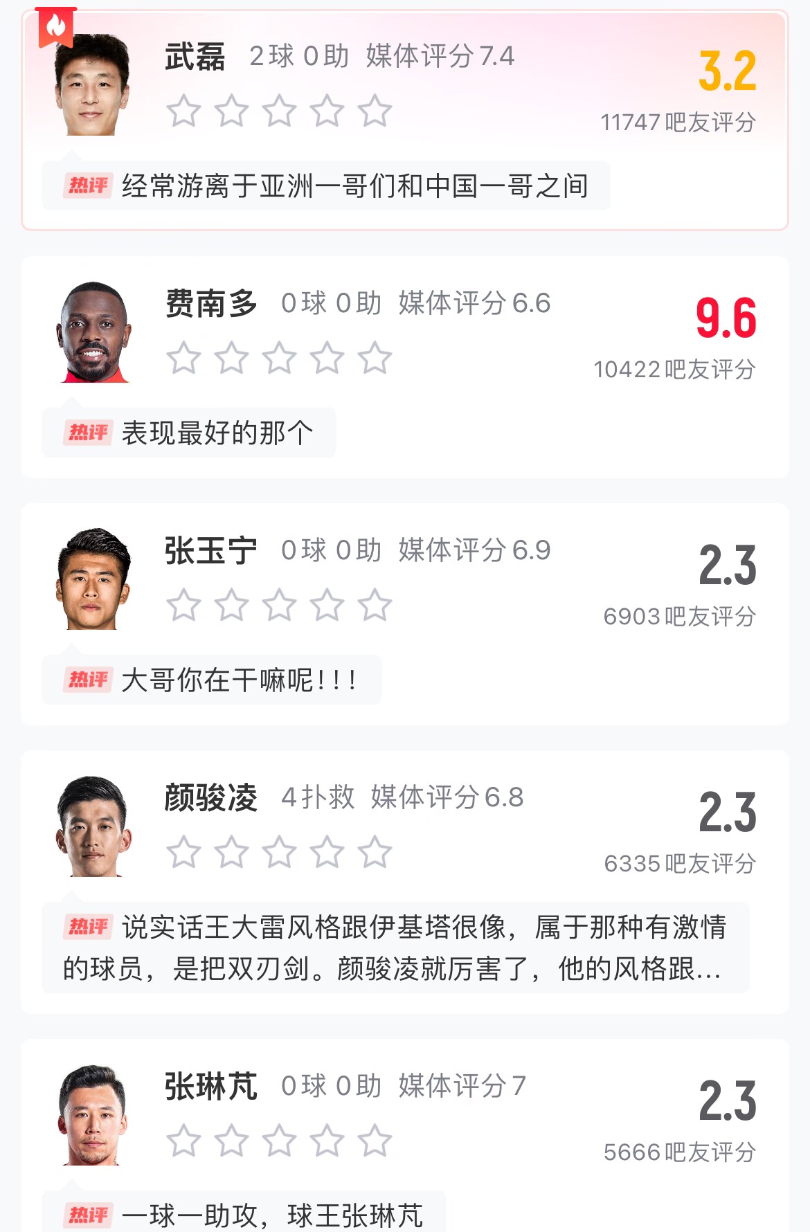 费南多国足首秀表现出色,获得吧友9.6的高分,李源一获评6.4分,他们也是出场球员中唯二的及格球员。罚丢点球的武磊只有3.2分,张琳芃、颜骏凌、张玉宁都只有2.3分,伊万科维奇执教国足首秀获评3.5分。