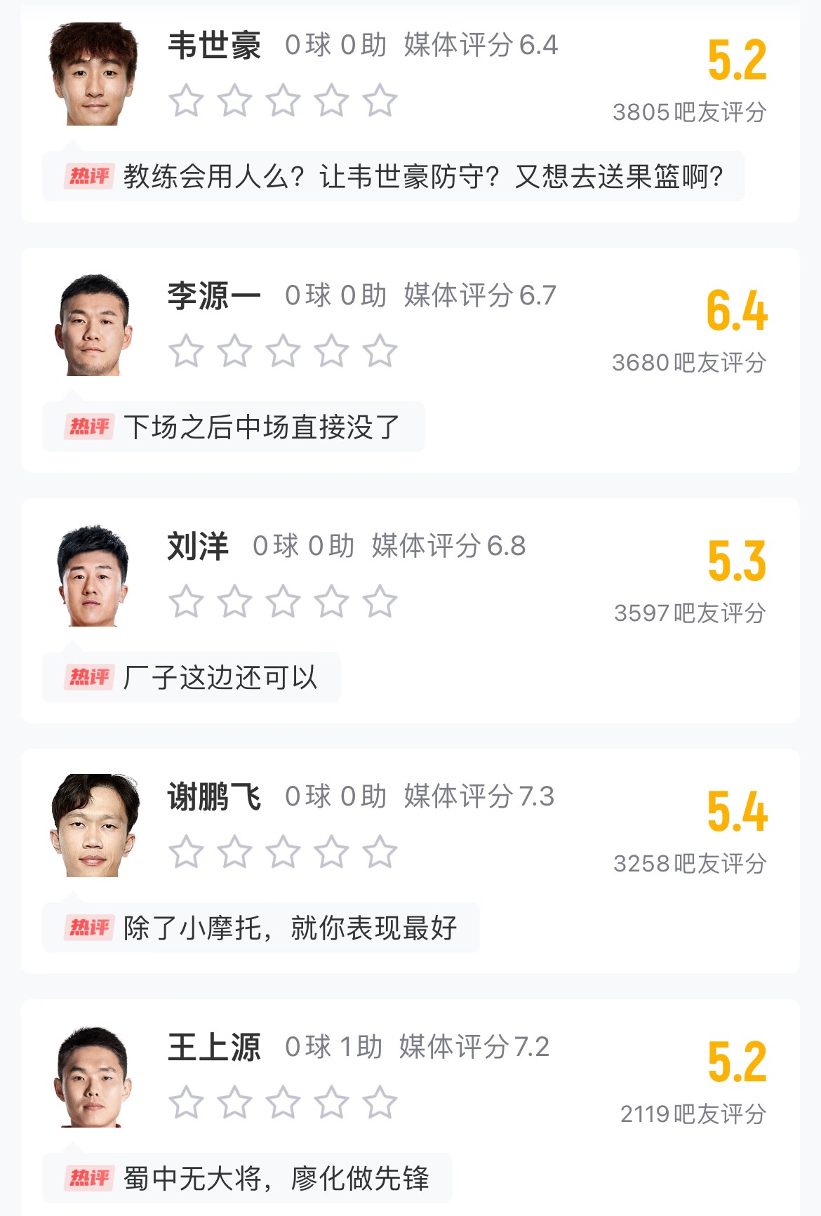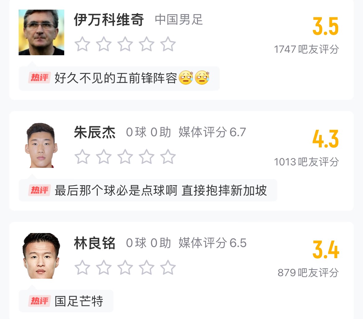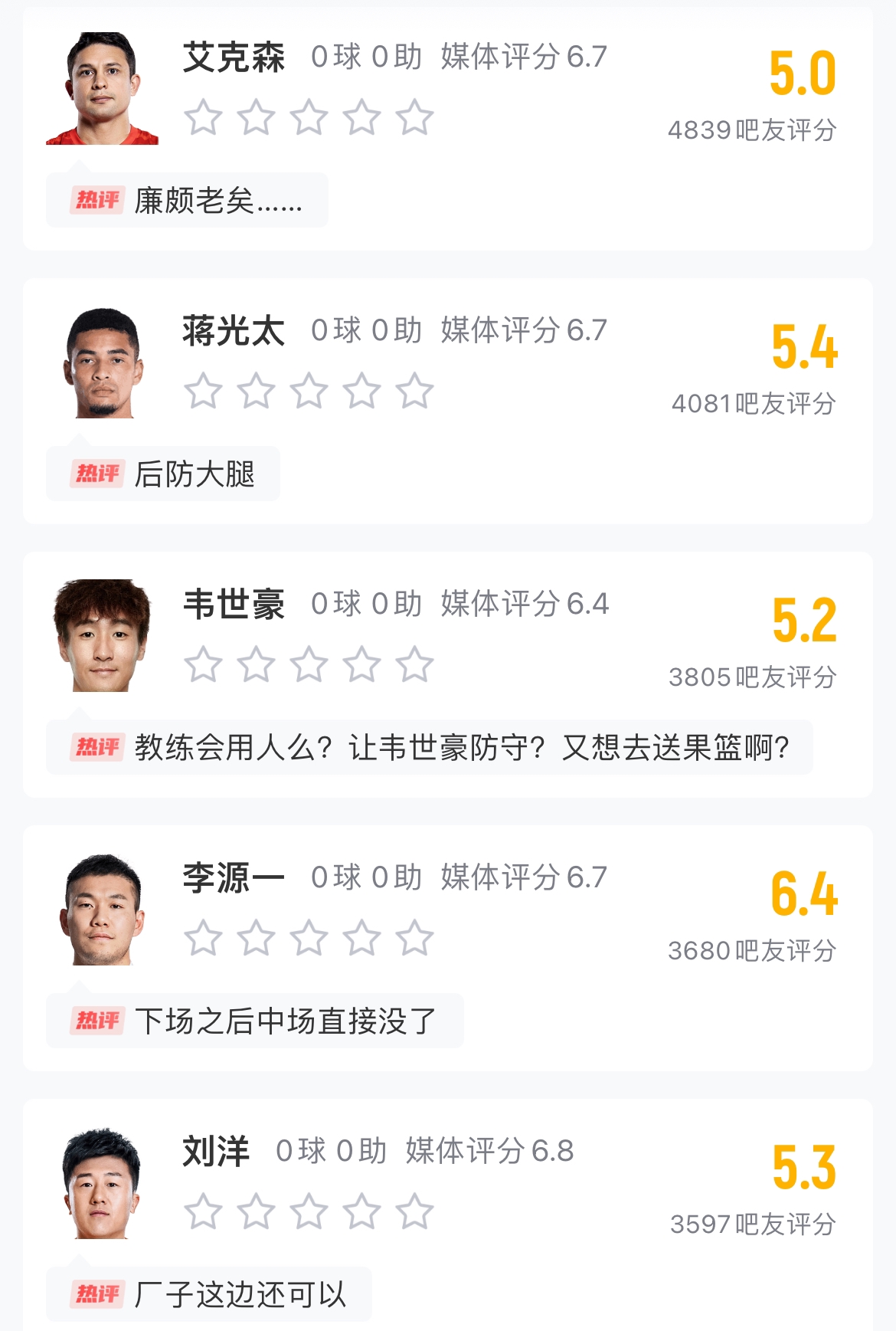 世预赛,国足在两球领先的情况下被新加坡逼平。吧友不满国足表现,给大部分出场球员打不及格分。评分戳