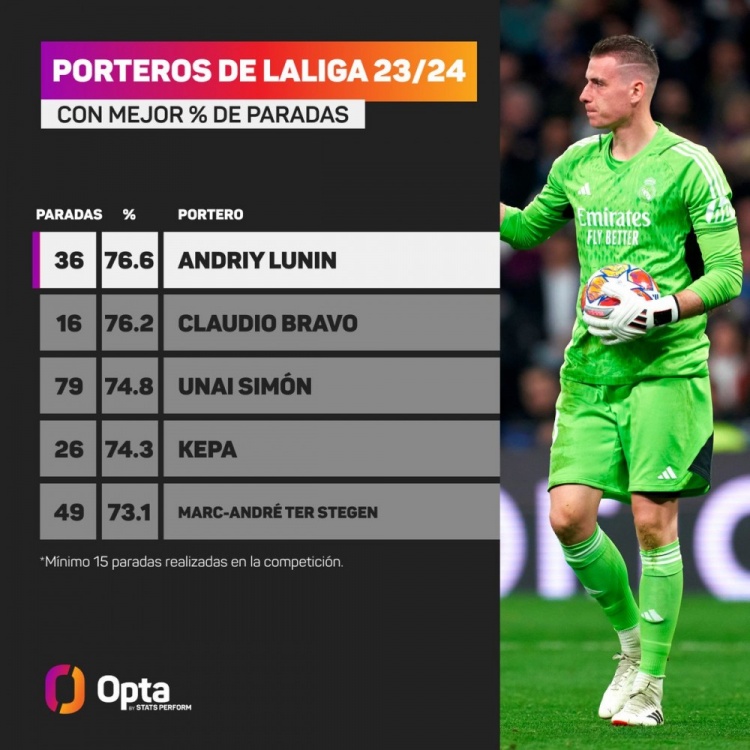 3月22日讯 Opta统计了西甲门将本赛季的扑救成功率,并列出榜单,皇马门将卢宁以76.6%成功率居首。