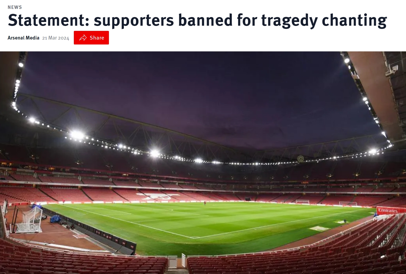三名阿森纳球迷因在2023年1月7日对阵利物浦的主场比赛中犯下五级公共秩序违规(悲剧性口号)罪名,分别被判处3年的观赛禁令。