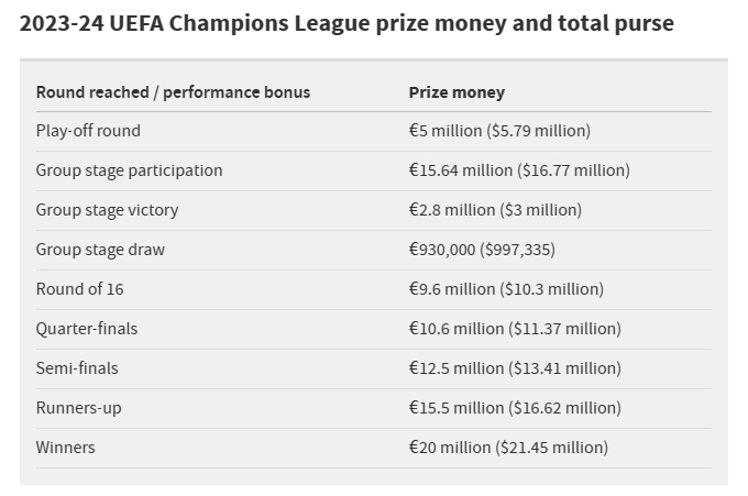 此外,参与小组赛的球队将至少获得1564万欧元,小组赛赢球奖为280万欧&平局93万欧。晋级淘汰赛(16强)的球队则将额外获得960万欧。