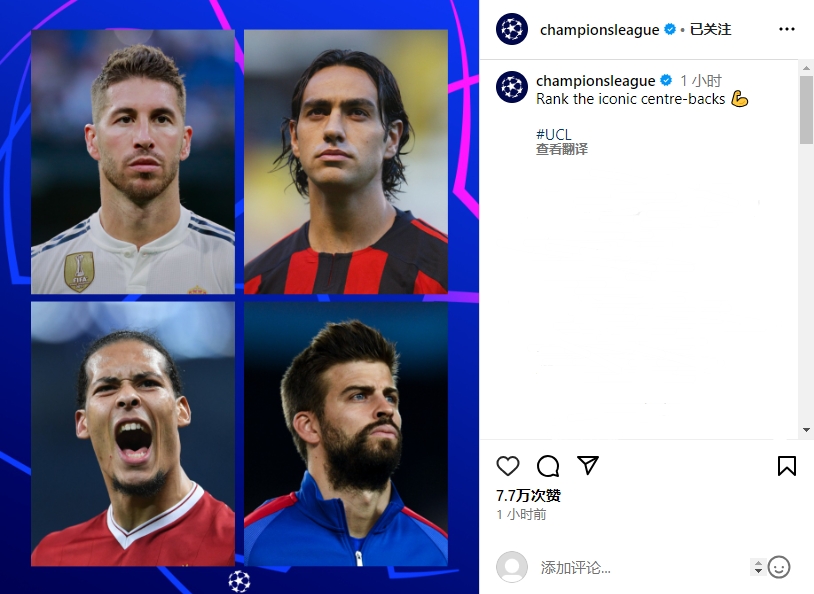 欧冠官方发问:Rank the iconic centre-backs(给这四位标志性的中卫排序)。