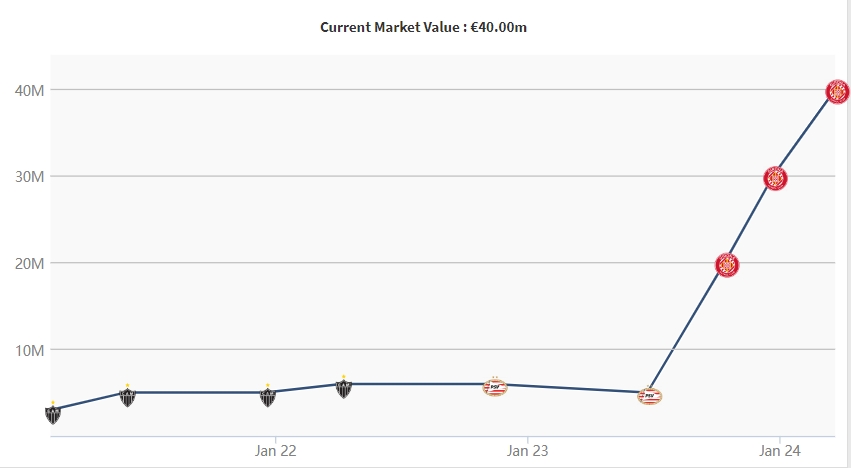 03月22日讯 德转更新西甲球员身价之后,赫罗纳的19岁边锋萨维奥继续飙升,已经达到了4000万欧。