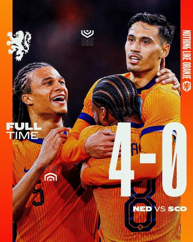 友谊赛荷兰主场4-0大胜苏格兰,赖因德斯传射建功,维纳尔杜姆、韦霍斯特、马伦破门,加克波助攻双响。
