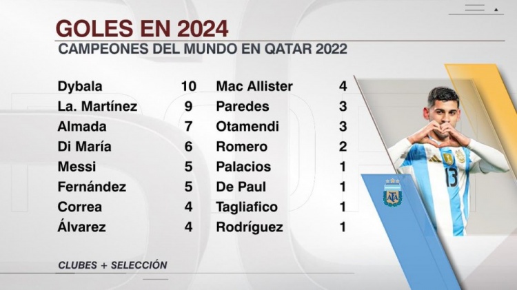 ESPN统计了阿根廷国脚(指2022年世界杯冠军成员)2024年在各赛事中的进球数量,并列出榜单,迪巴拉以10球居首,劳塔罗9球次席,阿尔马达以7球排名第三位。