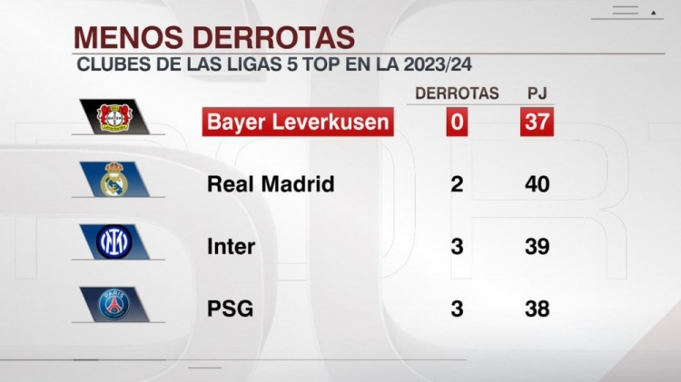 3月15日讯 欧战1/8决赛次回合比赛战罢,ESPN统计了本赛季五大联赛球队在所有赛事中的失利场次,并列出榜单,勒沃库森不败居首。
